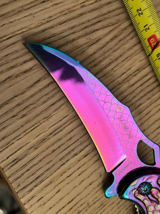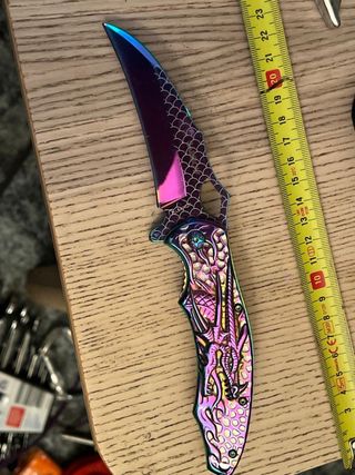 Coltello con design accattivante e colorato, ispirato alla figura di un drago. - Lama con finitura iridescente e squame. - Impugnatura dettagliata con motivi drago. - Design multicolore.