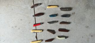 Set di 11 coltelli di diversi stili e dimensioni. - Coltello con manico in legno e anello. - Due piccoli coltelli bianchi con iscrizione DUBONNET. - Coltello con manico madreperla. - Coltello con immagine di Roma. - Coltello rosso. - Coltello Pallés. - Coltello Extremeña in legno. - Coltello multiuso con cavatappi. - Coltello rosso. - Coltello con finitura metallica.