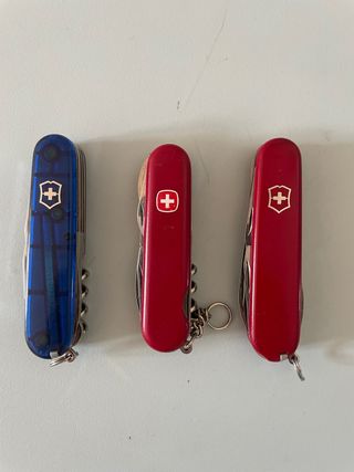 Lotto composto da tre coltellini svizzeri Victorinox. - Un coltellino blu traslucido, modello climber - Due coltellini rossi. - Marchio Victorinox visibile su tutti i pezzi ( uno modello spartan - l’altro è un wenger )