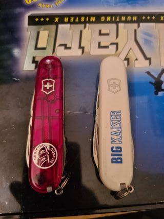 Due coltellini Victorinox, uno rosso trasparente e uno bianco. - Coltellino rosso con REGISTRO 6C 2500 stampato. - Coltellino bianco con BIG KAISER stampato.