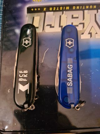Coppia di coltellini Victorinox pubblicitari usati ma in ottime condizioni - Logo Victorinox presente su entrambi. - Scritta BCF FKB sul coltellino nero. - Scritta SABAG sul coltellino blu.