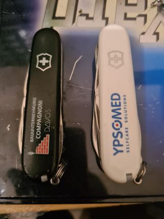 Coppia di coltellini Victorinox pubblicitari usati ma in ottime condizioni. - Uno nero con logo BAUUNTERNEHMUNG COMPAGNONI DAVOS e disegno di mattoni. - Uno bianco con logo YPSOMED SELFCARE SOLUTIONS.