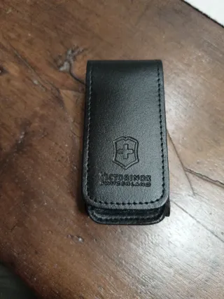 Elegante custodia in pelle nera per coltellini Victorinox. Presenta il logo inciso modello 4.0557.03 per coltelli Victorinox 91 mm o per kit Sos - Materiale: Pelle - Colore: Nero - Logo Victorinox inciso Completamente nuova, fondo di magazzino