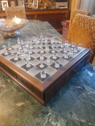 Elegante scacchiera con pedine realizzate in cristallo trasparente. Il set include tutti i pezzi necessari per giocare. - Scacchiera con base in legno scuro. - Pedine in cristallo lucido.