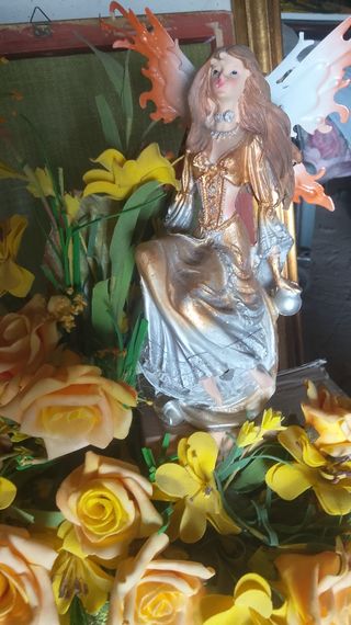 Deliziosa composizione con una fatina e fiori artificiali. - Fatina con ali colorate. - Fiori di colore giallo e rosa pesca. - Ideale per decorazioni. Dimensioni 30x 20x 33h
