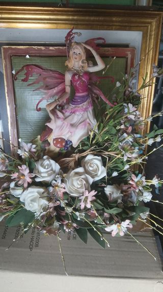 Deliziosa composizione con una fatina e fiori decorativi. - Fatina dettagliata con ali rosa. - Fiori bianchi e rosa. - Elementi decorativi come funghi. Dimensioni 30x 20x35h