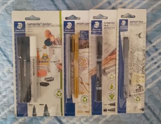 Set di pennarelli indelebili Staedtler Lumocolor. - Pennarelli Lumocolor marker. - Pennarelli Lumocolor duo permanent. - Pennarelli pigment liner. Per tutte le superfici Bianco e nero di diverse dimensioni Oro e argento