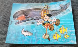 Cartolina con una scena di Pinocchio. - Illustrazione di Pinocchio con balena e pesci. - Illustrazione di Pinocchio con Geppetto inseguiti dalla Balena - Immagine a doppia scena.