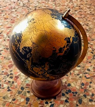 Elegante mappamondo da tavolo con finiture dorate su sfondo nero. Perfetto per arredare con un tocco di classe. - Base in legno. - Dettagli geografici in rilievo dorato. Circa 40 centimetri