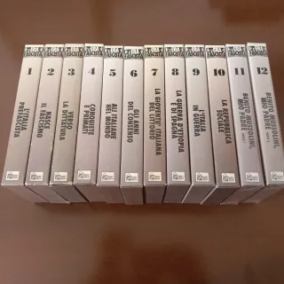 Completa collezione di 12 VHS L'era del Fascismo. - Volume 1: L'Italia Prefascista - Volume 2: Nasce il Fascismo - Volume 3: Verso la Dittatura - Volume 4: Conquiste e Primati - Volume 5: Ali Italiane nel Mondo - Volume 6: Gli Anni del Consenso - Volume 7: La Gioventù Italiana del Littorio - Volume 8: La Guerra d'Etiopia e di Spagna - Volume 9: L'Italia in Guerra - Volume 10: La Repubblica Sociale - Volume 11: Benito Mussolini, Mio Padre Parte I - Volume 12: Benito Mussolini, Mio Padre Parte 2