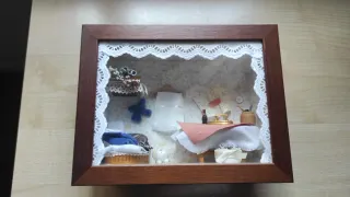 Delizioso diorama che riproduce una casa in miniatura. - Arredamento dettagliato. - Decorazioni in pizzo.Manufatto artigianale (vedi etichetta).
