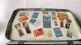 Iconica scatola di latta vintage marca storica #Bertolini con decorazione floreale e rombi. Segni di usura dello smalto. Da collezione o vecchi ricordi. - Immagine sul coperchio con cane e bambina. - Bordatura rossa. - Motivo a rombi blu e azzurri sui lati. - Fascia centrale con fiori gialli.