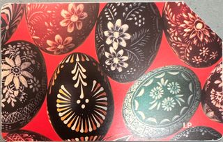 Scheda telefonica con un'illustrazione di uova di Pasqua decorate. - Design con uova colorate e motivi floreali. - Sfondo rosso vivace. Edizione limitata dfella Mantegazza Arti Grafiche