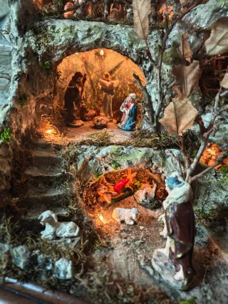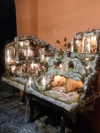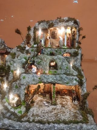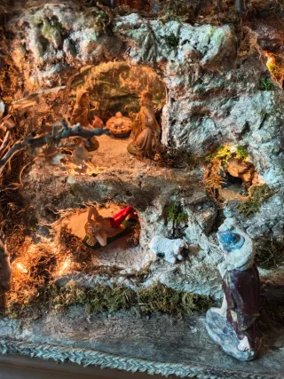 Presepe natalizio realizzato a mano per creare l atmosfera magica delle feste completo di luci,luce forno con effetto fuoco, cascata realistica e mulino a vento in pratica un ambientazione molto suggestiva I pastori nn sono inclusi ma utilizzati solo per scenografia foto reali prezzo poco trattabile