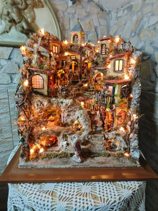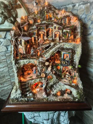 Presepe natalizio realizzato a mano, perfetto per creare l'atmosfera magica delle feste. - Dettagli curati e finiture artigianali. - Illuminazione integrata per un effetto suggestivo. - Ambientazione suggestiva con casette e paesaggio. - Ideale per la decorazione natalizia. Completo di luci,cascata,luce forno fuoco e mulino a vento foto reali