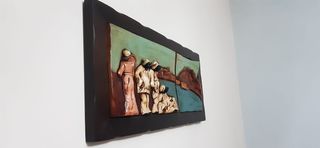 Bellissimo quadro artigianale raffigurante Pulcinella. 42,5 cm di altezza 95,5 cm di larghezza 4 cm di spessore - Realizzato in legno. - Dipinto a mano con colori vivaci. - Cornice scura che incornicia la scena.
