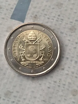 Moneta da 2 euro commemorativa della Città del Vaticano. - Anno di emissione: 2025. - Dritto: Stemma del Cardinale Camerlengo e stemma della Camera Apostolica. - Rovescio: Valore nominale e mappa dell'Europa. È come nuova.