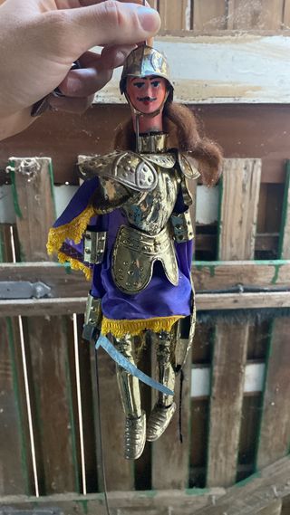 Marionetta ispirata al personaggio di Orlando Furioso, con armatura dorata e mantello viola. - Dettagli in metallo dorato. - Mantello in tessuto viola con frange dorate. - Elmo e spada inclusi.