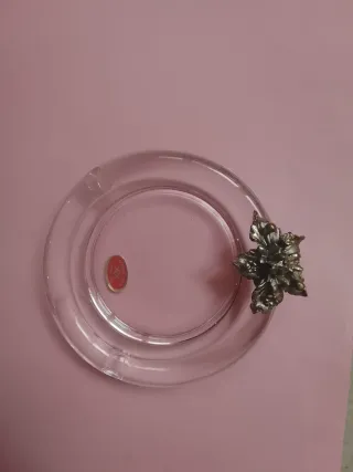 Elegante posacenere in cristallo trasparente, arricchito da un dettaglio decorativo a forma di fiore in metallo brunito.un altro sempre in cristallo semplice.2 pezzi - Materiale: Cristallo e metallo. - Design: Fiore in rilievo.