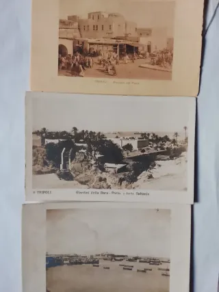 Tre cartoline storiche raffiguranti Tripoli.in più Bengasi deposito del sale - Tripoli - Mercato del Pane - Tripoli - Giardini della Dara - Porto e forte Sultanìa - Veduta del porto con imbarcazioni -Eccezionale documento storico del '900