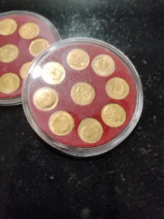 Ogni confezione a 55€. Set di mini monete placcate in oro (9 carati). Collezione delle Monete Più Piccole del Mondo. Ultimi esemplari, ormai molto rari. - Design dettagliato. - 9 monete per confezione. - 11 mm di diametro. - 0,21 grammi di peso per moneta. - Presentate in custodie protettive. Nessun cambio. Consegna a mano o spedizione via posta. #peseta, Amadeo, Alfonso XII, Alfonso XIII, Reina Isabel, 100 pesetas Franco, Juan Carlos