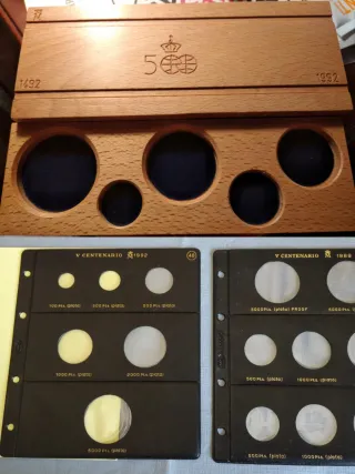 Set di materiale numismatico per esporre e conservare monete. Scatola in legno con scomparti per conservare le monete della serie V centenario. Custodie per album marca "Pardo" per monete di diverse dimensioni delle serie commemorative del V centenario della scoperta dell'America. Include fogli per monete da 100, 200, 500, 1000, 2000 e 5000 Pts. (argento). Le custodie mostrano iscrizioni come V Centenario 1992 e V Centenario 1989.