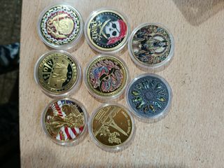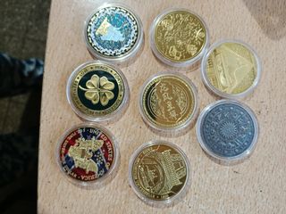 Collezione di 8 nuove monete commemorative, tutte in perfetto stato. Design dettagliato con motivi vari. Finitura metallica di alta qualità. Include custodie protettive individuali.