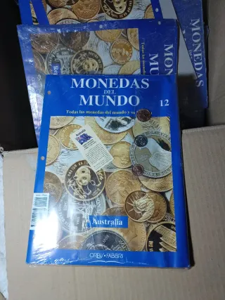 Collezione di fascicoli Monete del Mondo di Orbi Fabbri. 109 fascicoli con monete e banconote, 6 album per conservare le monete con le custodie. Include informazioni sulle monete del mondo. Copertina con immagini di varie monete internazionali. Sono inclusi altri fascicoli senza monete.