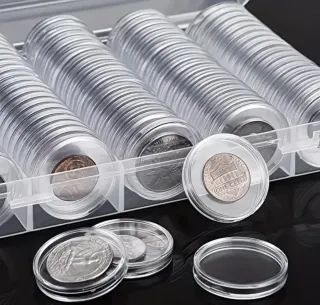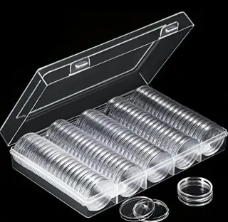 Set di custodie trasparenti per conservare le tue monete. - Materiale: plastica trasparente. - Design: rotondo, con bordi rialzati. - Quantità: 5 file da 20 custodie 100 pezzi in scatola trasparente - Chiusura: scatola con coperchio a incastro.