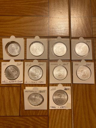 Set di 18 monete d'argento, alcune presentate in astucci di legno e altre nei loro imballaggi originali. Circa 260gr di argento in totale. - Include una replica della prima moneta da 1 peseta del 1869. - Alcune monete sono in custodie di plastica individuali. - Si notano dettagli in rilievo sulle monete. - Monete da 2000 ptas, 12€, 2 ECU d'argento, 2 mezzo dollaro americano e versioni in peseta d'argento.