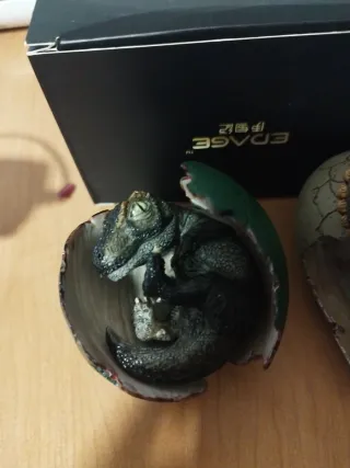 Set di tre figure decorative di dinosauri baby che escono dalle loro uova. Ogni figura ha un design e un colore unici. - Tre figure di dinosauri. - Design di uovo rotto. - Dettagli dipinti a mano. Prezzo per tutte e 3.