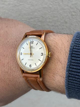 Orologio vintage Mondia Everyday NOS (New Old Stock) - Revisionato! Splendido orologio da polso vintage marca Mondia modello Everyday. * Condizioni: NOS (New Old Stock), ovvero nuovo, mai indossato, ma proveniente da un vecchio stock di magazzino. * Revisionato completamente da orologiaio professionista, perfettamente funzionante. * Cassa in acciaio placcato oro, diametro 34mm (esclusa corona). * Quadrante argentato con indici e lancette dorate. * Cinturino in pelle marrone, nuovo. * Movimento meccanico a carica manuale. * Vetro plexiglass senza graffi. * Un pezzo da collezione, perfetto per gli amanti del vintage. * Disp