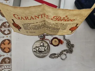 Orologio da tasca Perseo con certificato di garanzia. - Modello con nave Santa Maria incisa. - Certificato di garanzia Perseo. - Numero di serie: 185786. - Sigillo in ceralacca con stemma.