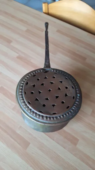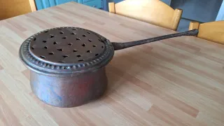 Antico scaldaletto in rame, un pezzo d'epoca con un fascino unico. - Realizzato in rame. - Design con coperchio traforato. - Manico in metallo scuro.