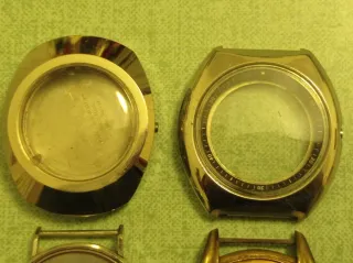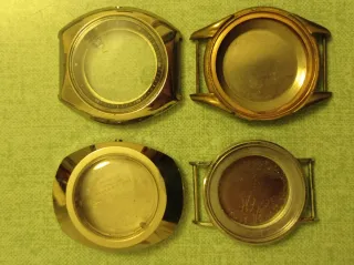 4 casse vintage per orologi: di cui 2 con anse fisse (una diametro mm 33,5 una diametro mm 37,5)(diametri interni mm 23 e 29) jowissa diametro mm 35x42 (interno mm 26,5) quella senza fondello diametro mm 38 (interno mm 23) Per restauro ricambi riparazione collezione creazione.