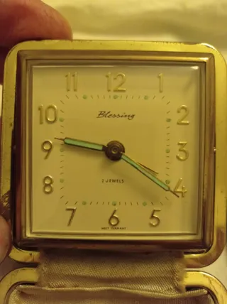 Set di 4 orologi sveglia vintage da viaggio: 3 Blessing, made west Germany - quadrante mm 58x58, funzionante, sveglia ok - 8 giorni, quadrante mm 67,5x67,5 vetro rotto, sveglia ok ma non programmabile - 8 giorni, quadrante mm 67,5x67,5, NON funzionante (parte ma si ferma), sveglia ok 1 Monet Watch quadrante mm 58x58, non funzionante Per restauro ricambi riparazione collezione.