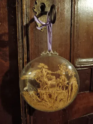 Delicato diorama cinese realizzato in sughero, racchiuso in una cornice circolare di vetro bombato. - Scena paesaggistica con architettura tradizionale. - Dettagli finemente intagliati. - Ideale come pezzo decorativo unico. - da appendere - diametro cm 10