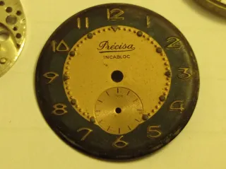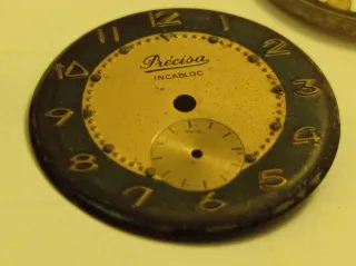 Ricambi vintage per orologio Precisa Carica manuale Cupillard incabloc Quadrante, fondello, vetroplastica, corona, base meccanismo Oggetto usato, per ricambi riparazione.