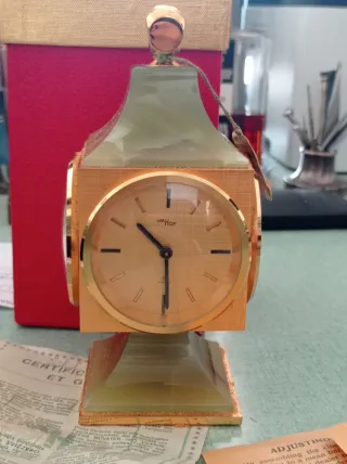 Orologio vintage da tavolo Imhof 8 giorni Orologio, barometro, termometro, idrometro (Quadranti diametrio mm. 60) Dimensioni cm 7x7x15 in metallo e pietra onice Certificato di garanzia, istruzioni, etichetta tag Custodia originale Funzionante, revisionato novembre '25 con garanzia 24 mesi Oggetto originale nuovo Nos.