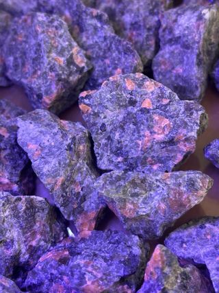 Pietre grezze di Yooperlite che mostrano una fluorescenza arancione brillante sotto la luce UV. Queste pietre uniche sono perfette per collezionisti o per chi cerca un pezzo naturale distintivo. - Pietre grezze di Yooperlite - Fluorescenza arancione sotto luce UV