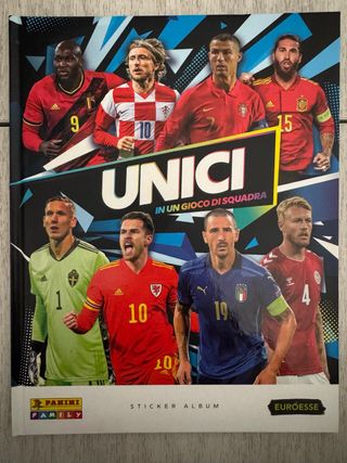 Album di figurine Unici Panini. - Copertina con giocatori di calcio famosi. - Edizione In un gioco di squadra. - Include Sticker Album e Euroesse.