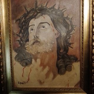 Antico dipinto a olio su tela.Ecce Homo,compreso di cornice barocca oro ,50x60cm, firmato, dipinto a mano. - Opera d'arte religiosa. - Raffigurazione di Cristo con corona di spine. - Firma dell'artista 'Esposito?' in basso a sinistra.