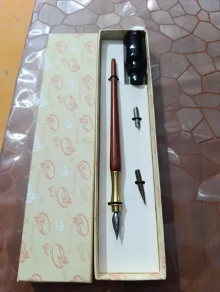 Elegante set per calligrafia con penna in legno e ottone e dettagli dorati. - Penna con impugnatura in legno e finiture in metallo dorato. - Include un flacone di inchiostro nero. - Due punte di ricambio per diverse esigenze di scrittura. Nonostante non sia mai stato usato presenta una leggera usura sul tappo della boccetta che non ne compromette l'uso.