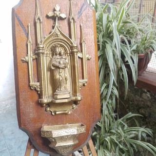 Antica scultura in metallo dorato con acquasantiera.in bronzo mis40x 20 - Raffigura la Madonna con Bambino. - Cornice gotica. - Montata su base in legno.