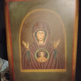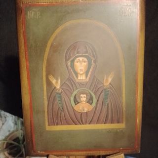 Antico dipinto a olio su tavola.antica icona russa ortodossa monastero Novgorod madre di dio dipinta a mano su rame( detto: ramino) mis.23x17; rara e originale, stilizzata molto bella e rara,; - Raffigurazione della Madonna con Bambino. - Cornice in legno.