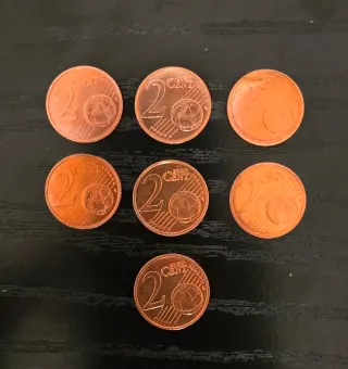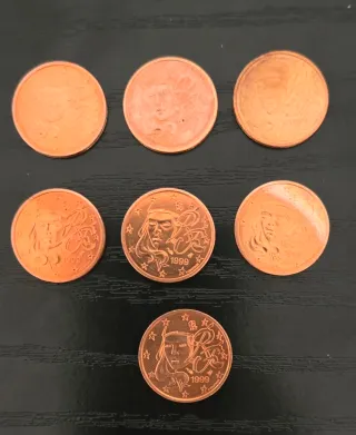 Set di sette monete da 2 centesimi di Euro, coniate in Francia nel 1999. In perfette condizioni.
