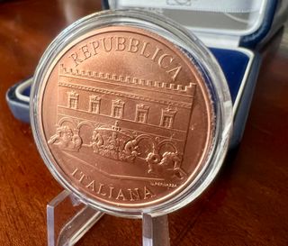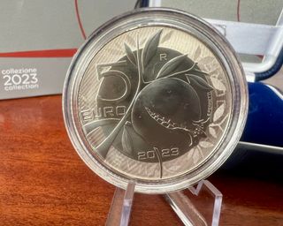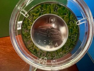 Moneta commemorativa da 10 Euro per la Ryder Cup 2023 tenutasi a Roma. Realizzata in argento, presenta una colorazione che la rende unica. - Dritto: raffigurante il Colosseo e un'aquila. - Rovescio: dedicato alla Ryder Cup con il trofeo e le bandiere. - Anno di conio: 2023. - Metallo: Argento.