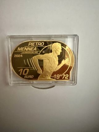Moneta commemorativa da 10 Euro in oro dorato, dedicata a Pietro Mennea. - Anno di emissione: 2024 - Valore nominale: 10 Euro - Finitura: Dorata Proof - Soggetto: Pietro Mennea La Freccia del Sud - Anno del record: 1972
