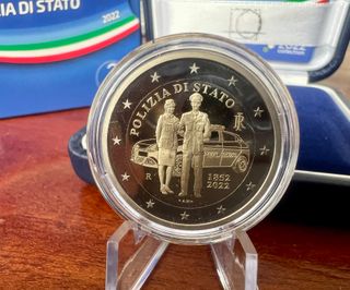 Set di 2 monete da 2 Euro commemorative del 2022. - Celebra il 170° Anniversario della Fondazione della Polizia di Stato. - Anno di emissione: 2022. - Valore nominale: 2 Euro. - Include la moneta in confezione originale.