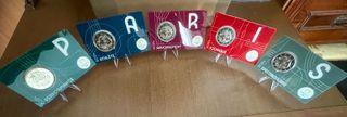 Set di 5 monete da 2 Euro Francia 2024 dedicate alle Olimpiadi di Parigi. - Monete in versione FDC (Fior di Conio). - Ogni moneta rappresenta una lettera della parola PARIS e un tema legato alle Olimpiadi: Performance, Athlète, Rayonnement, Iconique, Spectaculaire. - Anno di emissione: 2024. - Tema: Giochi Olimpici di Parigi 2024.